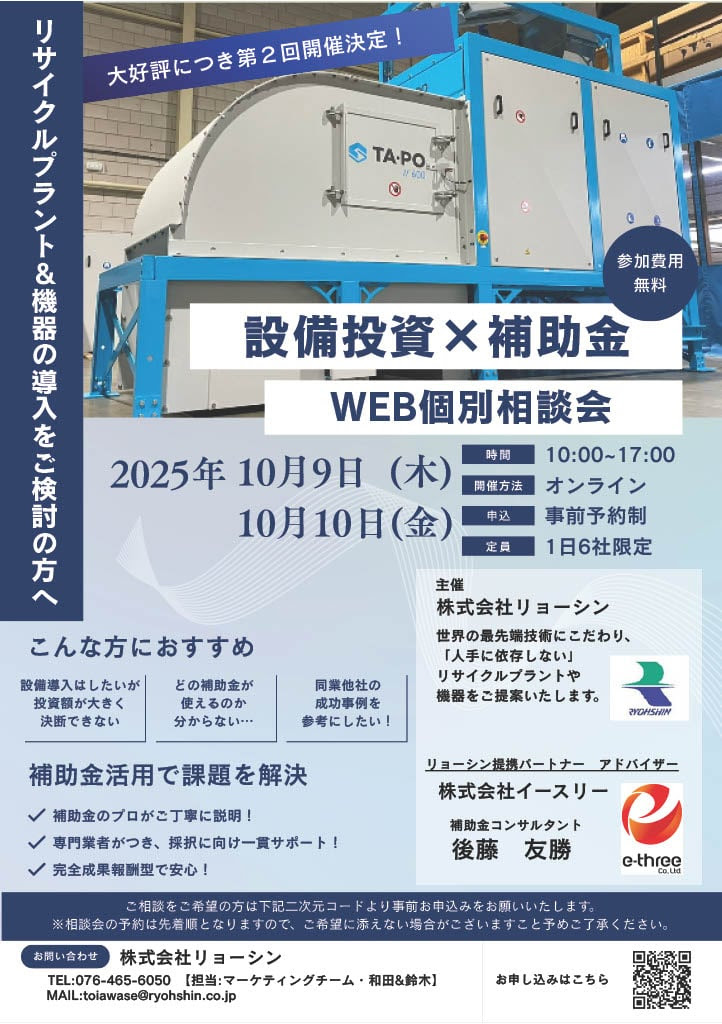 リサイクル設備メーカーの株式会社リョーシンと連携し、設備投資と補助金活用をテーマにした無料WEB個別相談会を開催いたします。
